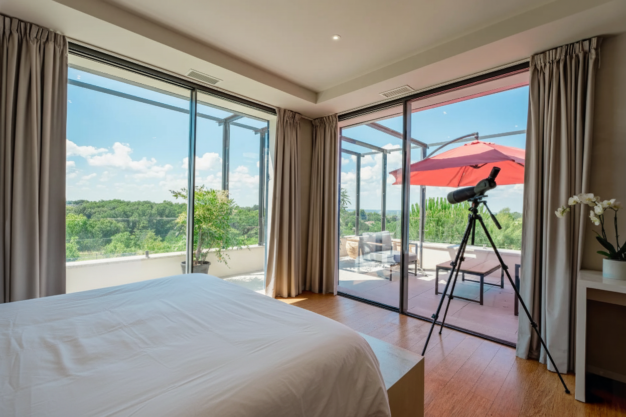 Le Domaine de La Peyrine se situe sur les coteaux offrant une vue panoramique imprenable sur les environs de Bordeaux. Ce havre de paix a été pensé autour d’un ancien bâtiment viticole et de ses vignes. Les cinq hectares de jardins et de vergers offrent le cadre idéal pour se déconnecter dans un lieu luxueux et lumineux tout en respectant l’environnement. Engagés dans une démarche vertueuse et écologique, les propriétaires ont conçu un bâtiment autosuffisant en parfaite intégration avec le contexte.